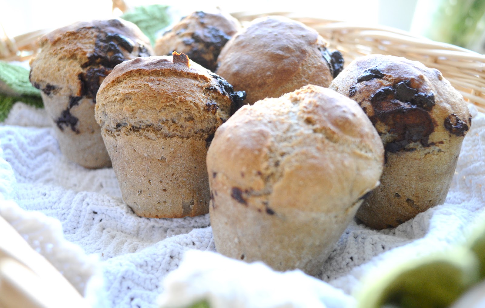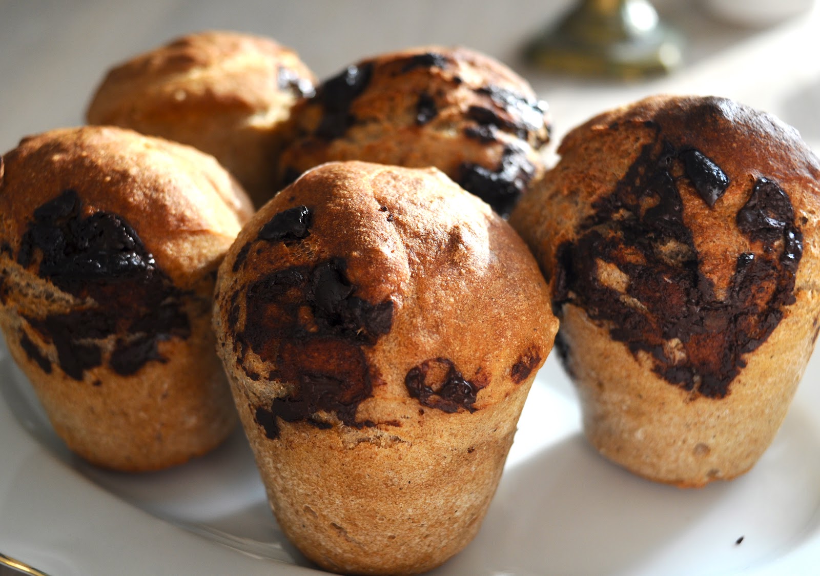 Efter 12 timer tages dejen ud og fyldes straks i muffinsforme med to skeer. Formene skal i første omgang kun fyldes halvt op. Når det er gjort, hakkes chokoladen groft og drysses over dejen. Ovenpå chokoladen lægges lidt mere dej, så formene nu er fyldt helt op.