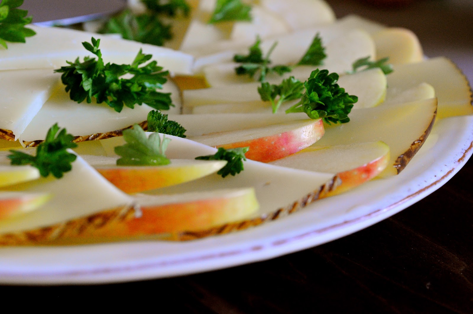 Jeg er endelig ved at være færdig med mit speciale, og det er virkelig en stor befrielse. Det har været en lang proces og har krævet meget tid sammen med mig selv, nok lidt for meget. Så nu er det dejligt, at det snart er afleveret, så jeg har tid til at være sammen med mine venner og familie igen. Grunden til at jeg nævner det er fordi min kæreste og jeg tog glæderne lidt på forskud den anden dag, og drak lidt champagne for at fejre, at jeg snart var i mål. Og når der er champagne skal der jo også en lille snack til, og det blev denne her appetizer, som jeg har lavet nogle gange før, og som jeg selv er helt vild med. Jeg er ret glad for den spanske Manchego ost. Den er mild, men har stadig en karakteristisk smag, og så har den nærmest en smøragtig eftersmag. Den er skøn. Jeg serverer den sammen med et sødt rødt æble og frisk persille, hvilket er en kombination, som smager skønt og så ser det ikke mindst rigtig flot ud på et fad. Halvtreds procent af denne rets charme kommer fra anretningen, så det er en meget vigtig del. Hvis man har lyst kan man også udskifte æblet med pære.