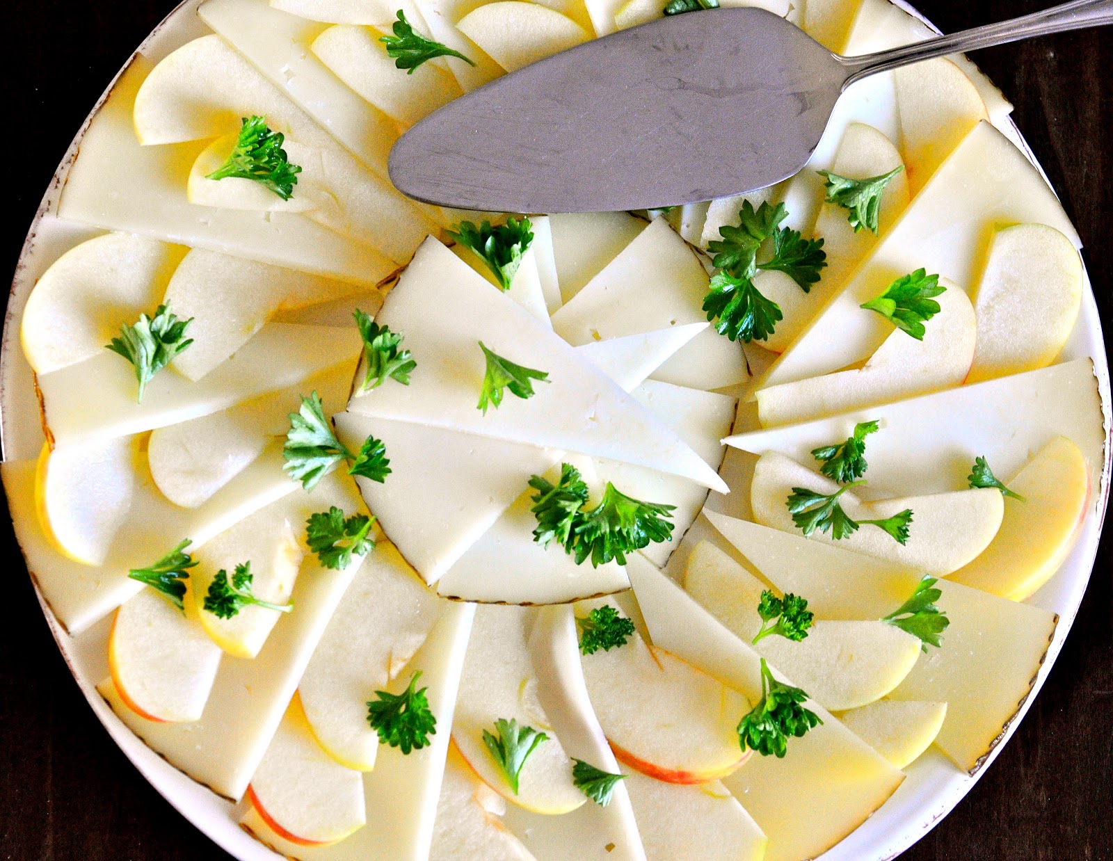 Skær manchegoen og æblet i fine skiver og læg skiftevis ost og æble rundt på et fad. Pynt med frisk persille og server.